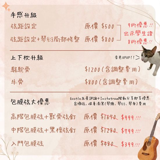 吉他教學 / 烏克麗麗教學 / 練團室租借 / 展演空間租借 / 樂器保養維修 / 燈光音響